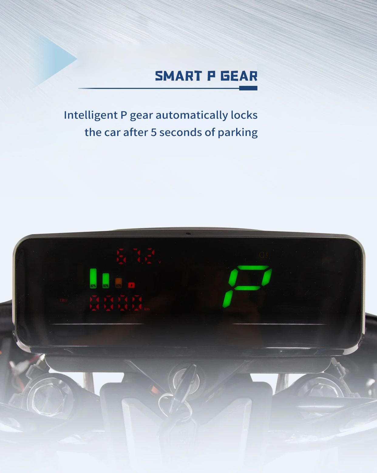 4. Intelligent P Gear : The vehicle features an intelligent P gear function. which automatically locks after 45 seconds of parking. ensuring safety when the vehicle is stationary.