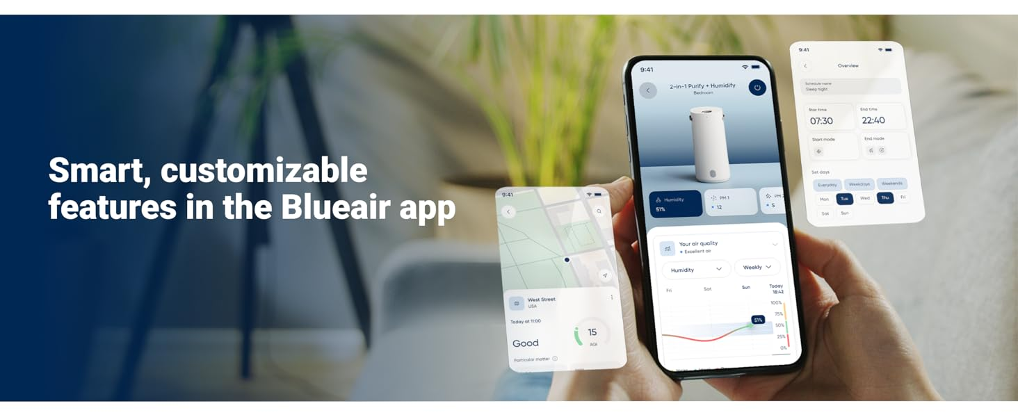 DUAL ACTION FOR ULTIMATE WELLNESS: Blueair's HEPASilent Technology purifies dirty air. while 360° InvisibleMist Technology humidifies dry air. delivering ultimate aircare with clean. fresh air and balanced humidity—all in one powerful solution.