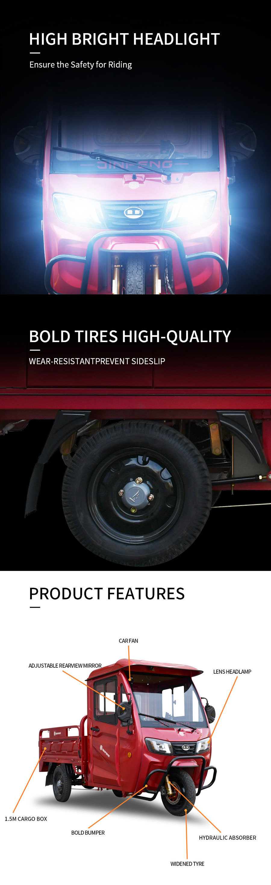 The vehicle features a closed driving cabin at the front. which provides protection from rain and sun. The cabin also comes equipped with a fan. which provides a cool breeze during hot summer days.