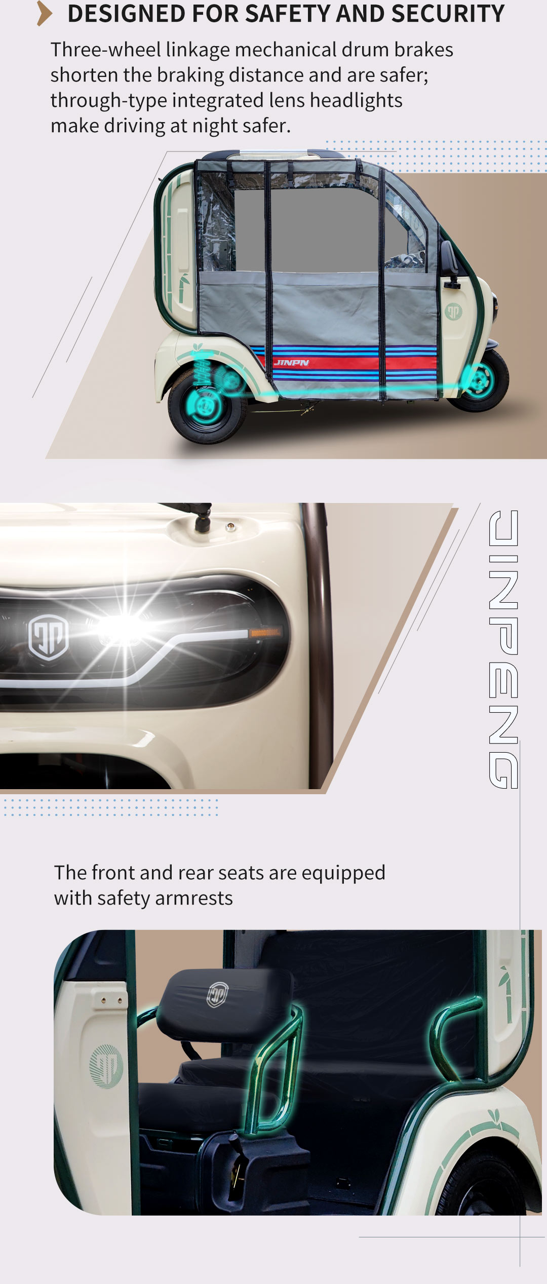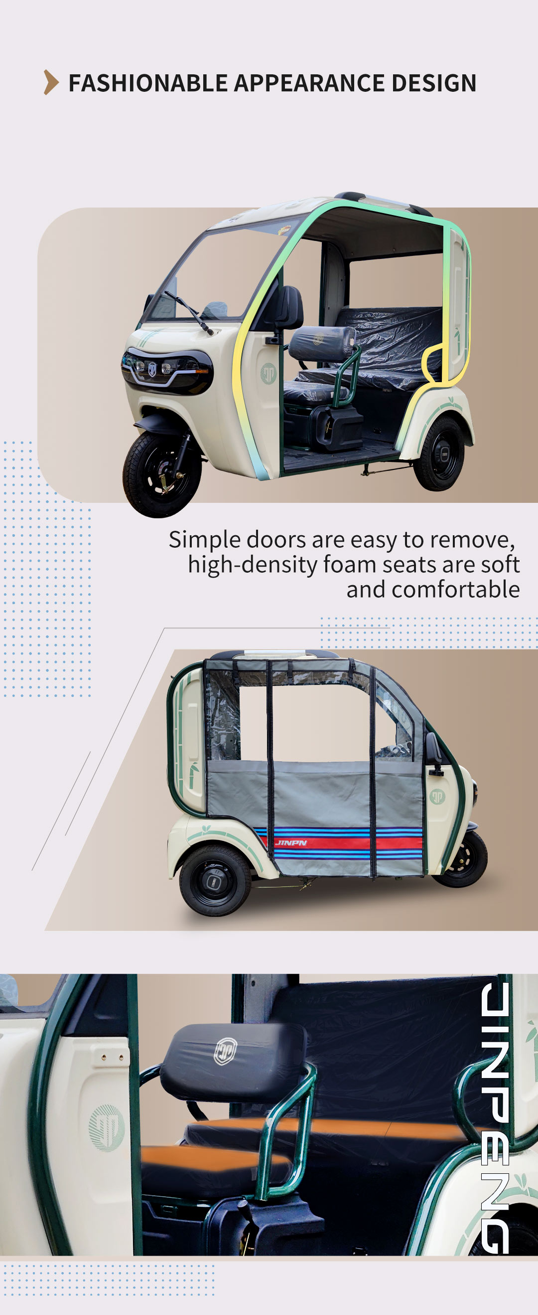 The Jinpeng DK is an electric passenger trike for short-distance travel in urban and suburban areas. It has a three-wheel design that provides stability and safety while riding. Here are some specific applications and use cases for the Jinpeng DK: