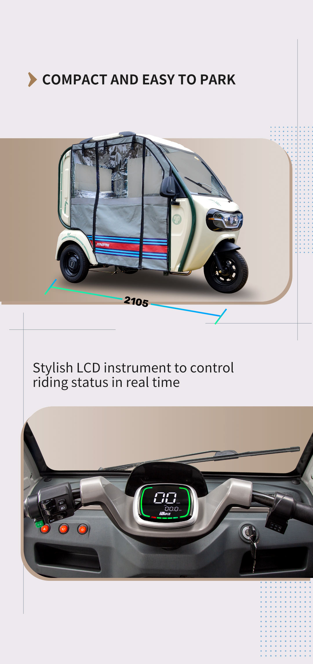 In summary. the DK electric passenger trike has a spacious cab. comfortable ride. rain & sun protection. and high-brightness headlights. making it a popular choice to meet transportation needs