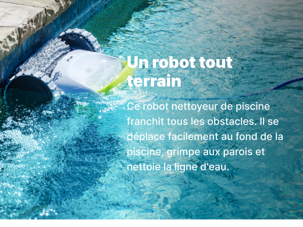 • An all-terrain robot: This pool cleaner robot overcomes all obstacles. It moves easily across the bottom of the pool. climbs the walls and cleans the water line.
