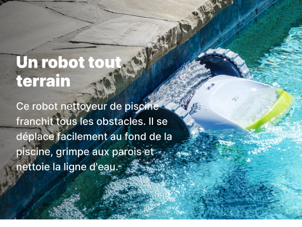 • An all-terrain robot: This pool cleaner robot overcomes all obstacles. It moves easily across the bottom of the pool. climbs the walls and cleans the water line.