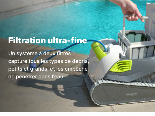 • Ultra-Fine Filtration: A dual-filter system captures all types of debris. large and small. and prevents it from entering the water.