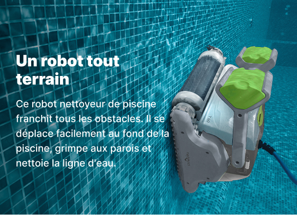 • An all-terrain robot: This pool cleaner robot overcomes all obstacles. It moves easily across the bottom of the pool. climbs the walls and cleans the water line.