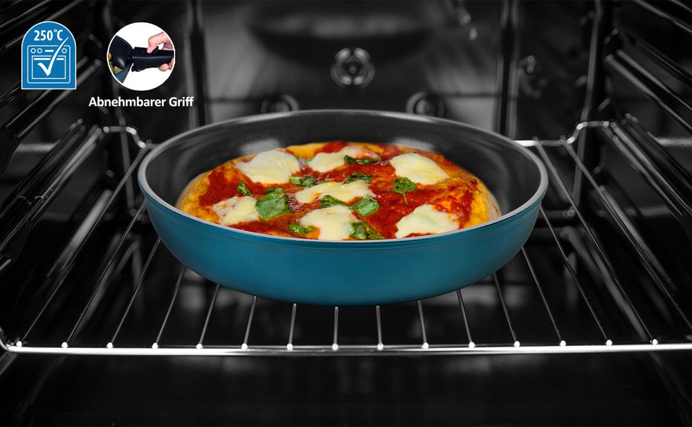 💪 Dieses Kochgeschirr ist extrem langlebig dank seiner Mehrfach-Beschichtung aus Aluminium, Edelstahl, Nano-Keramik und Polymer. Die Pfannen und Töpfe sind in verschiedenen Größen erhältlich und bis zu 250 Grad Celsius backofengeeignet, was dir maximale Flexibilität bietet.