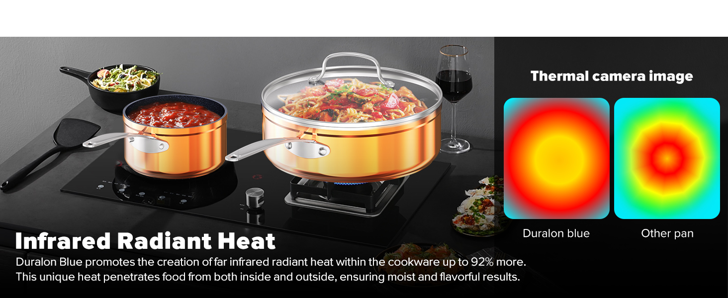 HEALTHY DURALON BLUE COATING – The eco-friendly, ultra-non-stick Gen10 Duralon Blue is all-natural ceramic coating free of harmful chemicals like PFAS*, PTFE, PFOA, lead, and cadmium. It also does not emit toxic gases at higher temperatures. *Tested by TÜV Rheinland for 106 known PFAS elements and none were detected.