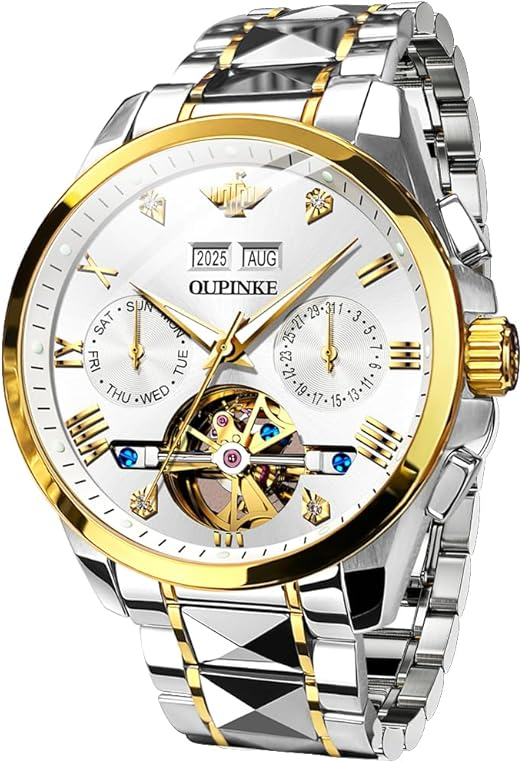 • OUPINKE Mens Watches Skeleton Automatic Mechanical Premium with Calendar Sapphire Crystal Tungsten Steel Waterproof Wrist Watch