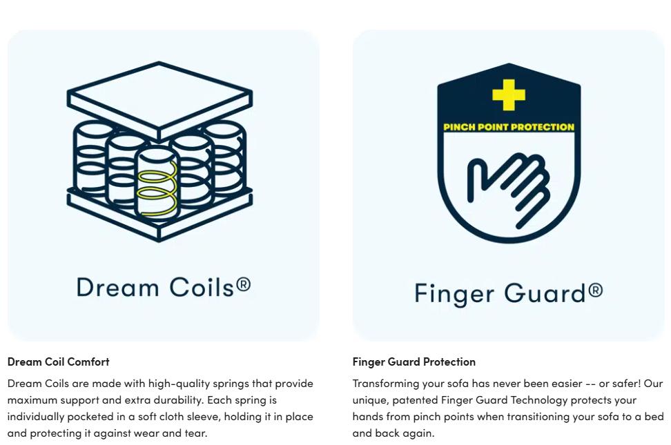 • Finger guard protection: transforming your sofa has never been easier -- or safer! Our unique patented finger guard technology protects your hands from pinch points when transitioning your sofa to a bed and back again.