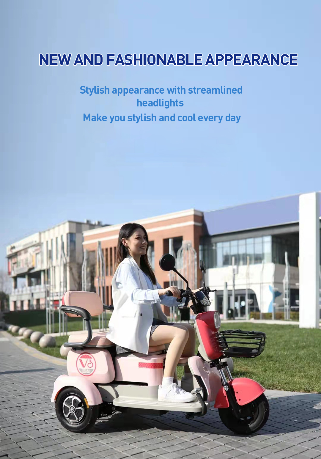 The V3 electric leisure tricycle combines a modern design. innovative seating. clear display. and practical storage solutions. making it the ideal choice for those looking for a stylish. functional. and convenient mode of transportation.