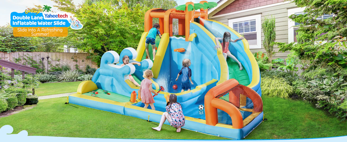 - Endless Fun: This inflatable water slide combo boasts two slides. two climbing zones. a mini golf course. soccer goal. water cannon. a spacious splash pool. a small deeper pool. basketball hoop. and two ring toss poles-providing hours of adventure for kids.