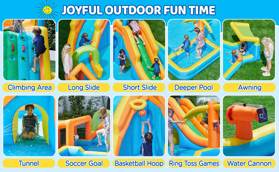 - 【Thrilling Water Adventure】Get ready for non-stop fun with our double-slide inflatable water park! It presents kids with multiple fun features for various enjoyments - 2 water slides. a large splash pool. a small deeper pool. a basketball hoop. a soccer goal. a water cannon. a tunnel. an awning. a cute palm tree ring toss target. and a climbing wall.