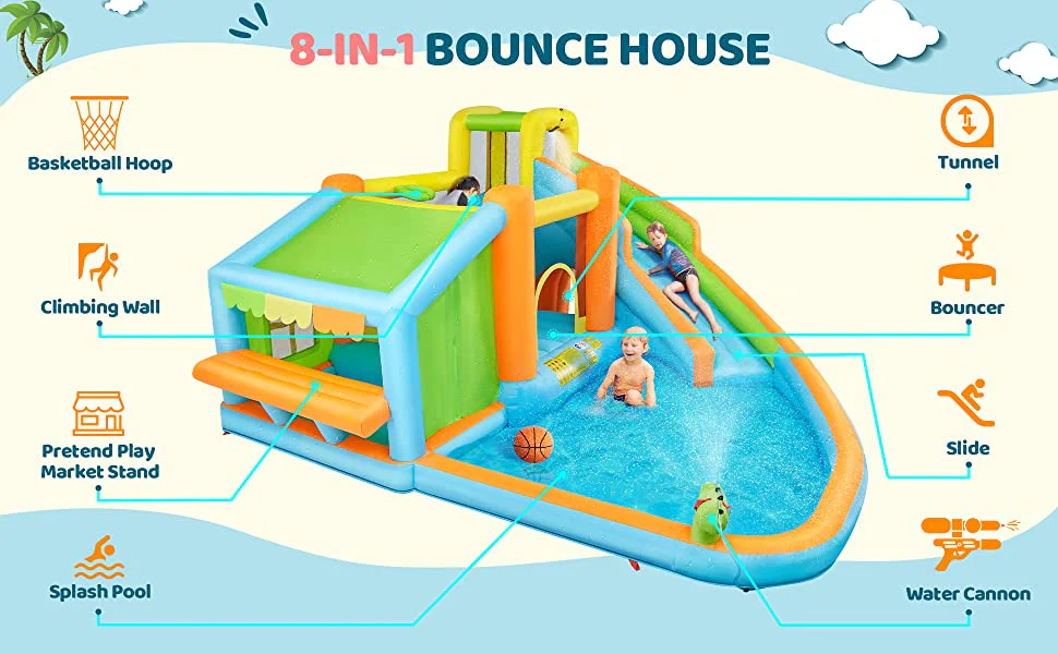 - 【Well-rounded Private Water Park For Kids】This 8-in-1 water bounce house ensures you and your kids hours of fun in the backyard. It features a large pool area. a slide. a water cannon. a climbing wall with footholds. a bouncer. a basketball hoop. a tunnel. and a cute market stand for pretend play. Suitable for 4 kids aged 3 to 10 (with 99 lb maximum weight for each kid).