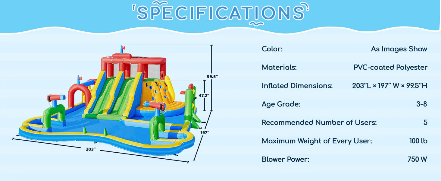 - Fun in Just Two Minutes: Powered by a 750W air blower. this extra-large inflatable water slide inflates in only two minutes while offering fun that lasts for hours. The UL-listed blower ensures safe. reliable operation.